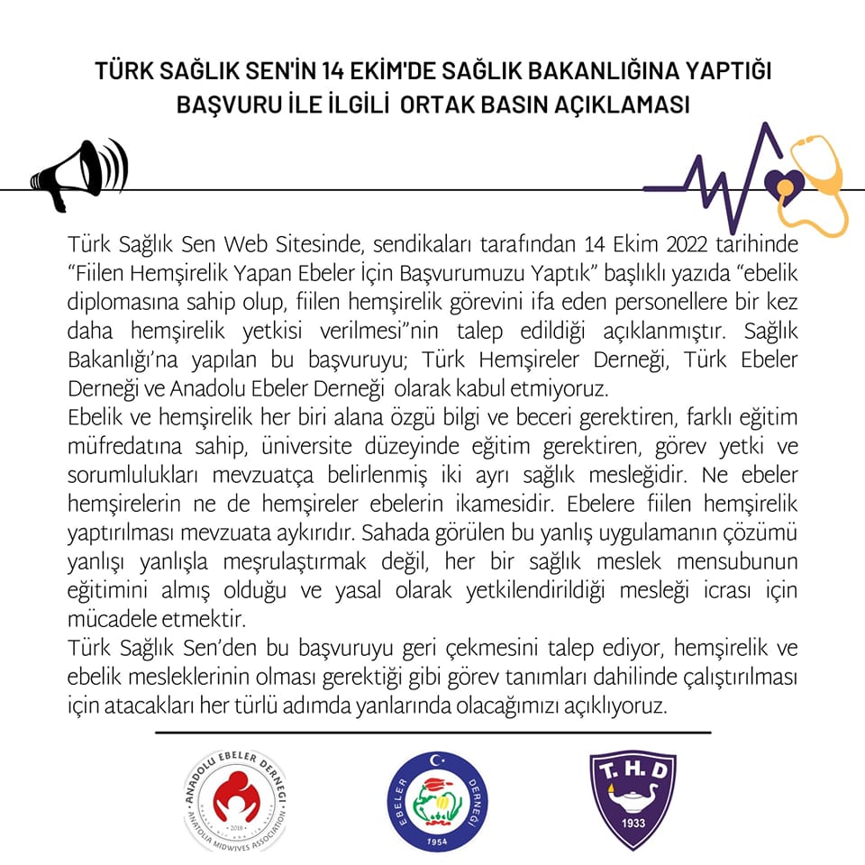 Ebelik meslegi Ulusal ve Uluslararası normları, eğitim süreçleri, yetki - görev ve sorumlulukları ile standartları belirlenmiş bir meslektir. Hiç bir surette savunuculuğu yanlış insan kaynakları yönetiminden kaynaklanan başka bir yanlış ile sürdürülemez. Böyle bir uygulama talebi kimsenin tasarrufunda olamaz. Ebelik mesleği için her türlü mesleki hak mücadelesi bu doğrultuda yürütülmelidir. Ebeler sadece ebelik yapmalıdır. Bundan doğan hakları korunmalı eğitim ve gelişim imkanları desteklenmelidir. Aksi kabul edilemez. Bakanlığımızın buna itibar etmeyeceği inancı ve beklentisi içerisinde Türk Sağlık-Sen'e hatırlatmamız toplum sağlığının korunması ve gelecek nesillerin refahı için ebeler sadece ebelik alanında görev almalıdır.